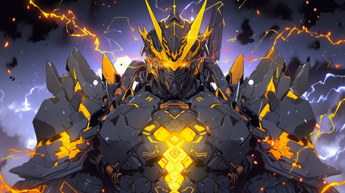 a upper body portrait shot of a man in demonic Futuristic Knight armor with yellow lightning accents and yellow lightning powers standing on top of a mountain in the middle of an intense battle --ar 16:9 --niji 5