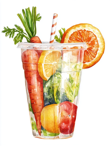 featuring ingredients likeCarrot, apple, tomato, lemon, orange mixed vegetable and fruit freash juice in a plastic cup in an illustration style, colorful and detailed. In Watercolour painting, In style of food art, detailed --ar 3:4