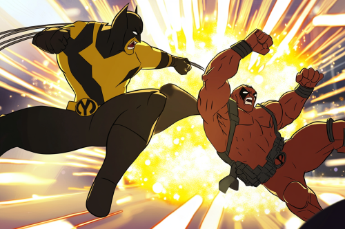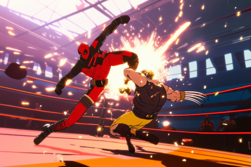 Wolverine’s Kick and Deadpool’s Reaction Description: In the midst of their fight, Wolverine lands a powerful kick to Deadpool’s side. Deadpool’s reaction is a mix of surprise and humor, his body twisting in the air from the force of the kick. The animation emphasizes the impact with dramatic golden lightning and energy bursts. The ring is animated with vibrant, high-contrast colors, capturing the excitement and energy of the battle. --ar 3:2 --style raw --stylize 0 --v 6.1