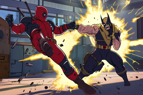 Deadpool’s Tactical Kick Description: Deadpool, with a mischievous grin, performs a tactical kick aimed at Wolverine’s midsection. The animation showcases Deadpool’s clever and unpredictable move, with vibrant colors and energy effects surrounding his foot. Wolverine, although surprised, braces for the impact. The scene is lively and fast-paced, with the action accentuated by animated lightning and motion blur. --ar 3:2 --style raw --stylize 0 --v 6.1