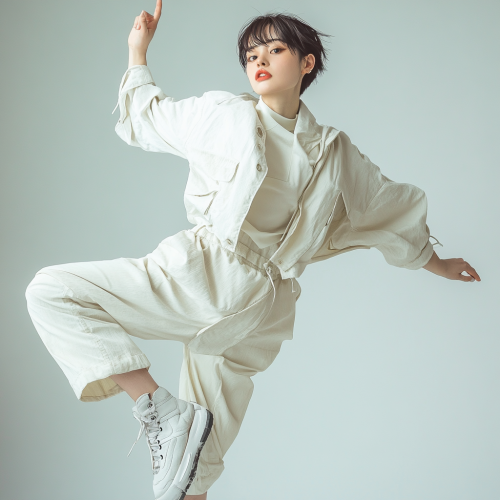 Full body view. 18 year old very cute Japanese fashion model. She wears fashionable, high-end brand clothes. She has short hair and has a hair color that matches her clothes. Photographed in a studio. High-definition. Canon EOS R6. [Photo pose: doing high kicks]