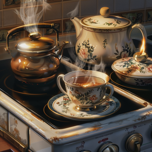masterpiece cup of chai boiling on a stove, teacup on the counter with sugar bowl; hyperrealistic style, highly detailed; add iridescent gold; rim lighting; silky smooth