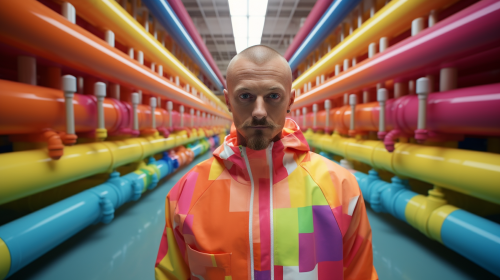 still image from a sparkling juice commercial, a male worker in a colorful jumpsuit overall are in the foreground looking into the camera, the location is a colourful juice laboratory, in the background we see a lot of giant pipes in different colors, more workers in colourful jumpsuits in the background, --ar 16:9 --c 10 --style raw --s 250