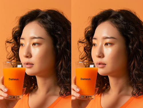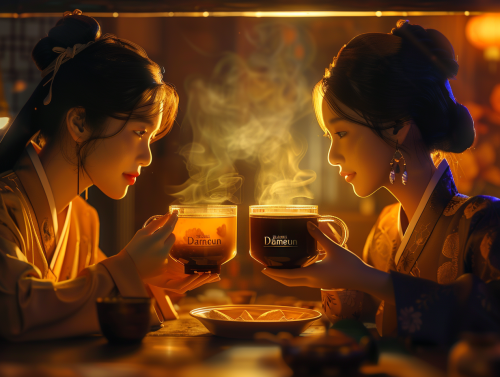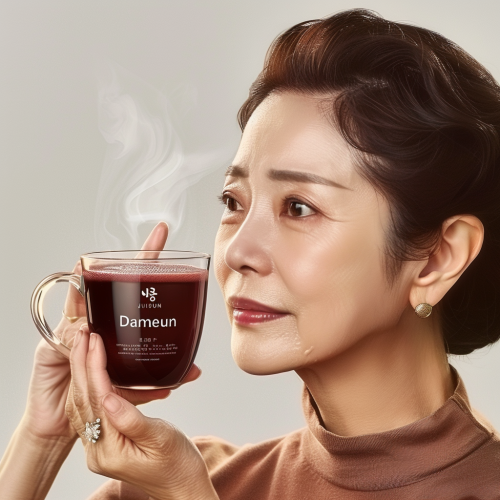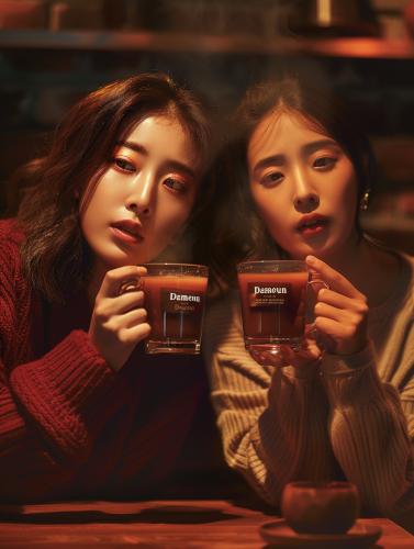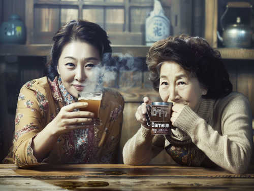 Korean women demonstrating the health benefits of jujube juice, Visible transformation as one woman appears younger from drinking the juice, her companion with wrinkles for not partaking, Close-up of the warm, inviting brown jujube juice in a "Dameun"-branded glass cup, emitting steam, A narrative of health and vitality, emphasizing the miraculous benefits of jujube juice, 3D rendering to capture the realism of the scene and the transformative effect, Detailed texture and lighting to showcase the warmth of the juice and the youthful glow, --ar 1:1