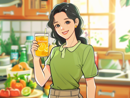A Korean mother showcasing her slender figure, attributed to drinking pumpkin juice, The glass cup of orange juice, bearing the "Dameun" name, is held aloft as a symbol of her success, The background shows a home setting, with healthy foods, reinforcing the healthy message, A bright and cheerful atmosphere, celebrating the benefits of pumpkin juice on wellness, cartoon style, Exaggerated features and vibrant colors to make the health benefits fun and appealing, --ar 4:3