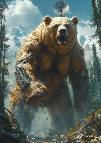 massive 70 feet tall giant angry bear standing in the woods outside of a bunker, dynamic pose, bear has a tiny satellite dish growing from the top of its head, the bear also has a mechanical arm --ar 5:7 --stylize 666 --v 6.1