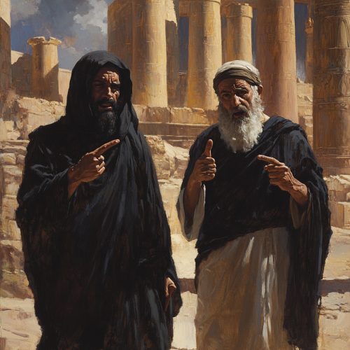 Two angry pharasees with long black robes pointing fingers at Jesus who is standing in the middle, Jesus' eyes are closed and his fae peaceful, white robes. Pharasees are mad with rage majestic temple pillars in the background