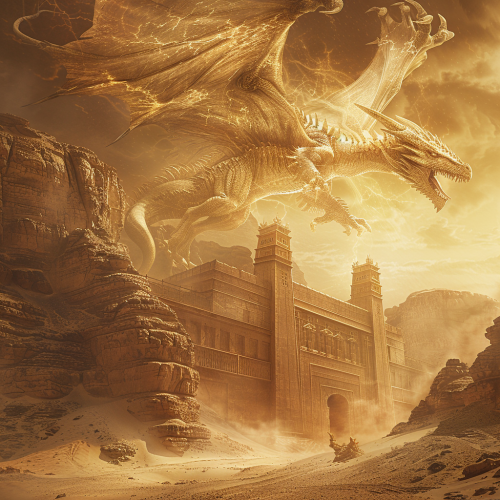 fantasy setting, zoomed out view, gargantuan-sized ancient Gold dragon hovering above a desert temple made of sandstone, dragon is glowing a beautiful golden radience