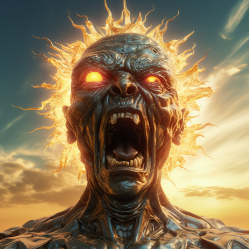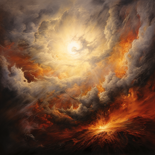 the sun covered by smoke clouds, godrays shining apon the four corners of the earth, artistic painting with a meaning behind it, the gods are angry
