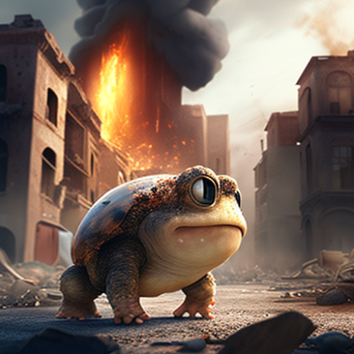 angry, mean looking realistic toad facing the camera, slowly walking away from the massive explosion of the building behind it, cool guys don’t look ta explosions, logo style --v 4