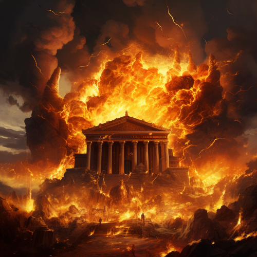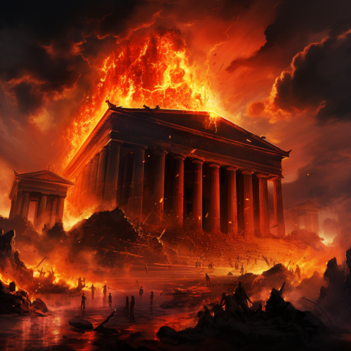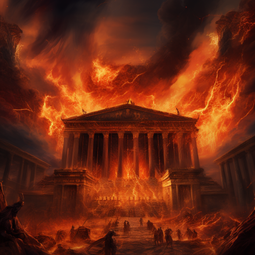 burning arthemis temple, huge ancient gods are above the arthemis, very angry, huge gods are in the burning sky above the temple, apollo, cronus, poseidon, zeus, arthemis, athena, dionysus, hera, hermes, eros