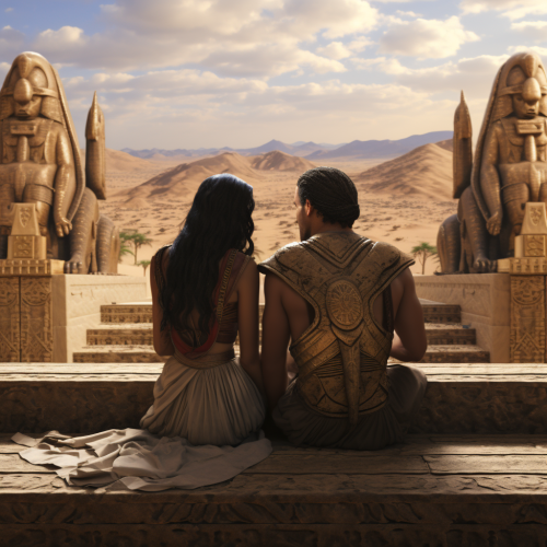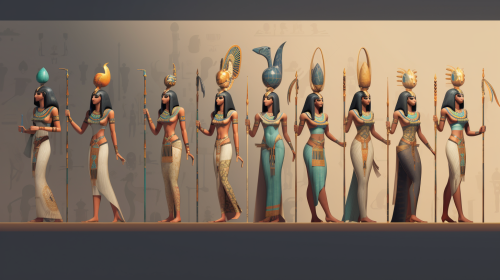 Create an image that visualizes the mythical act of fashioning human servants for the Egyptian gods, emphasizing the gods' creative prowess. Depict the gods sculpting and molding these servants in the grandeur of an Egyptian temple filled with divine energy. Content: Egyptian gods, majestic temple, crafting human servants. Medium: Digital art with an Egyptian mythological twist. Style: Mythical craftsmanship, showcasing the gods' divine touch. Lighting: Majestic and otherworldly, enhancing the mystical atmosphere. Colors: Regal Egyptian tones with an aura of divine creation. Composition: Digital painting showcasing the creation of human servants by the Egyptian gods. --ar 16:9 --v 5.1 --style raw --s 750
