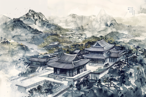 Ink painting style, the entire view of Korea's Haeinsa Temple from the sky --ar 3:2