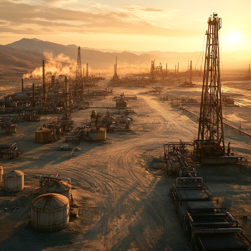 Picture a cinematic-style scene of a mature oil field during sunset. Aged drilling rigs and weathered equipment stand across a vast, dusty landscape, symbolizing decades of oil extraction. Storage tanks and pipelines are scattered around, some showing signs of rust. The golden sunlight casts long shadows, creating a striking contrast between the fading light and the industrial structures. Dust rises in the distance, adding to the dramatic, atmospheric setting.