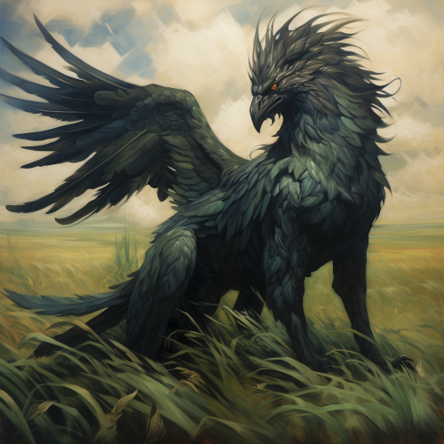 Rennaisance-style oil painting of a mythological black griffin alone in a green field. Dark fantasy.