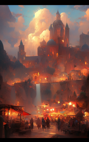 ( Masterpiece) Landscape, OIL painting of the best quality, highly detailed, dynamic lights and shadows, Castle market in a festive atmosphere, epic fantasy, inspired by the work of Frank Frazetta --ar 10:16 --niji 5