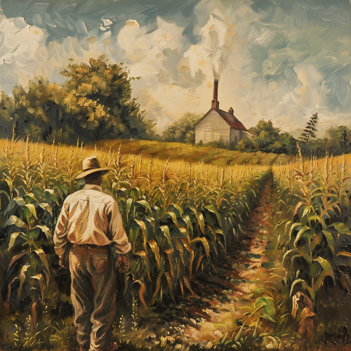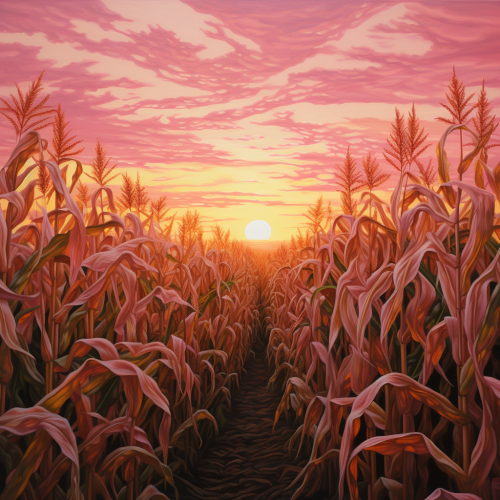 oil painting of a corn field with a pink sunset, highly detailed, art by caravaggio, wes anderson vibes