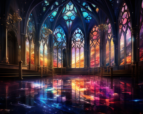 veracity and worship with styled stain glass windows in the cathedral of the cosmos, in the style of colorful gilded oil painting --ar 20:16 --s 210