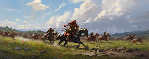 3d animation, oil paint style, battle on green field, epic, russian medival warriors on horses, oil painting, 3d disney, pixar cartoon --ar 20:8 --v 5.2