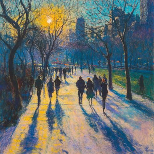 Pintura impressionista pastel e grafite de Frank weston benson numa cena em Nova York em um dia ensolarado, pessoas andando nas calçadas num parque ao lado da estacao de trem. Tinta encáustica a óleo, azul e neon fluo amarelo e verde e linogravura turquesa elétrica. árvores secas com galhos longos e secos. sombras das pessoas no chão são compridas