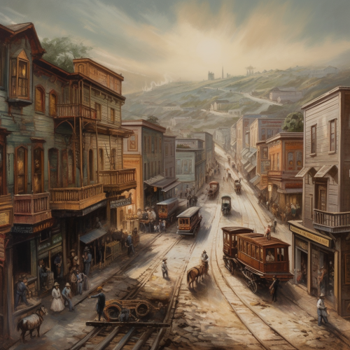 oil painting christmas eve in a busy town. The year is 1890. wreaths christmas lights and garland are found on the small stores. People walk home with presents. children pulled on sleds. a light snow falls. panaramic. high detail. --ar 16:9 --s 50 --v 5.2