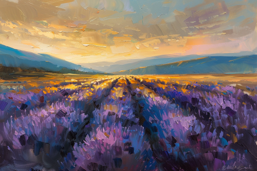 An oil painting of a lavender field at sunset, with mountains in the background and a golden sky. The lavender stretches to the horizon, with rich and deep colors, while the sunlight gently touches the flowers. Warm tones, soft light, elongated shadows. Created using: oil painting, impressionism, thick brushstrokes, rich textures, color blending, tranquil atmosphere, naturalistic composition, hd quality, natural look --ar 3:2 --v 6.0