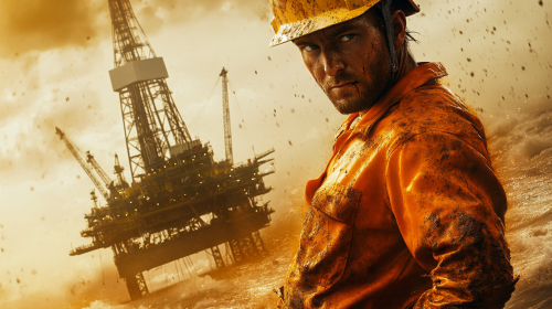 poster with oil rig worker with helmet at foreground, posing, orange dungarees, dirty, with oil rig far in background, verry detailed, realistic, 3d render high quality, --ar 16:9