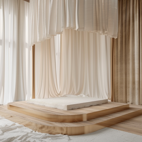 materail board with white moquette, brass tube,gypsum surface, white stage curtain , light oak wood
