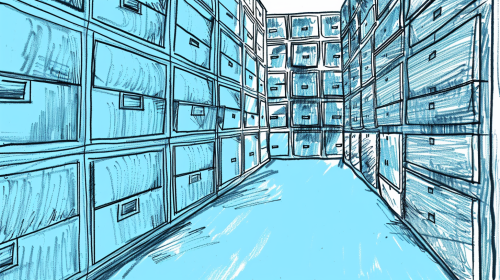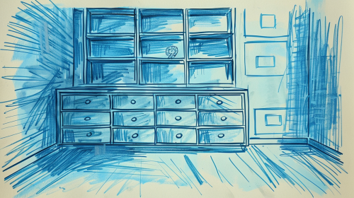 A simple line drawing of cabinet with many drawers in 4 x 5 . The outline is drawn with a thick black marker pen and filled in with a light sky-blue pastel crayon. --ar 16:9 --v 6.0