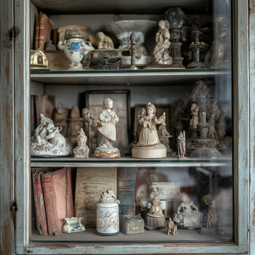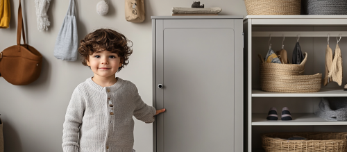 A little boy posing next to the gray cabinet with white shelves and inside. Next to her is an empty space for a picture or text on one of them. The cabinet stands in front of a wall decorated with hanging from wooden shelves. On top of it, there's some soft fabric. In the background, you can see other furniture such as boxes, shoes, and various accessories. It creates a cozy atmosphere and makes us imagine that we could place something related to kids' fashion here. --ar 87:38