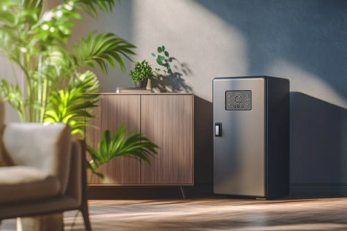 Realistic photo of a modern home safe placed in a contemporary living room, featuring a sleek metal exterior, digital keypad, positioned beside a minimalist cabinet, set against a clean and well-lit background. Photorealistic, realistic image, 8K resolution --ar 3:2 --v 6.1 --style raw