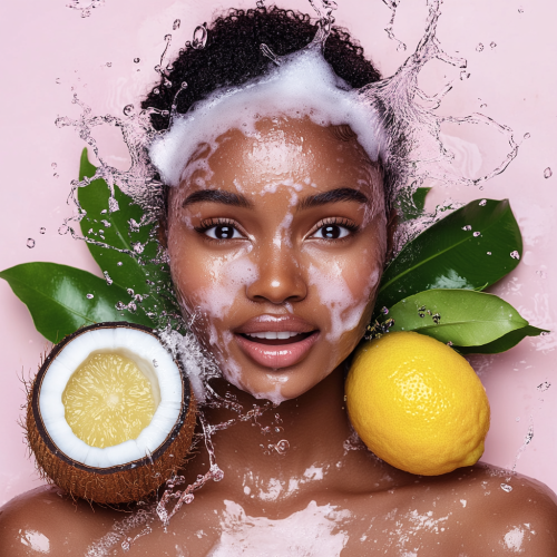African female model with nice and beautiful skin bodywash with water splash at the back and coconut and lemon with leaves as props in the background on light pink