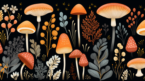 Botanical Illustration pattern of psychedelic mushrooms, butterscotch, pastel mini eggs, mushrooms and cacao. Psychedelic colors. --ar 16:9 --v 5.2 --s 250