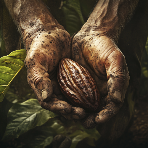 A realistic and dramatic image of a cacao farmer's hands holding a cacao pod, emphasizing the hard work and dedication involved in cacao production. The hands are rough and weathered, showing the labor and effort of the farmer. The background depicts a lush, verdant cacao plantation, representing the origin of the cacao. The composition is dramatic and impactful, with a focus on the textures of the hands and the cacao pod, capturing the essence of labor and the connection between the farmer and the land. The scene is rich in detail, emphasizing both the beauty and the toil of cacao cultivation