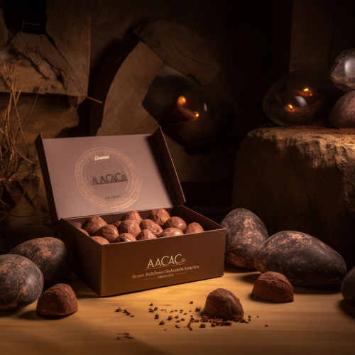 A dramatic and stylish image of melting chocolate flowing smoothly, paired with cacao beans. The scene captures the richness and allure of the chocolate, with a glossy, reflective surface that highlights its creamy texture. Cacao beans are prominently featured, symbolizing the raw and natural origins of the chocolate. The composition is dramatic, with a play of light and shadows to create a captivating and elegant atmosphere, emphasizing both the luxurious quality of the chocolate and the rustic, organic feel of the cacao beans