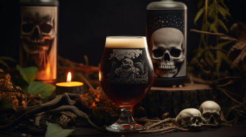 jungle sombre, hantée, feve de cacao, gousse de vanille, une bière noire stout au milieu --ar 16:9