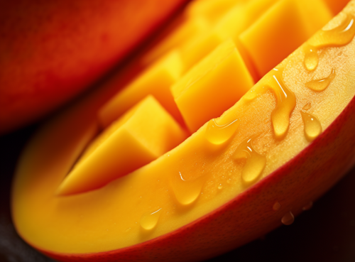mango fruit cut once, close up, Hyper-Realistic Image, 8k Resolution, Cinematic, Sharp Focus, Cinema, Perfection --ar 15:11