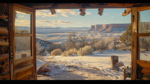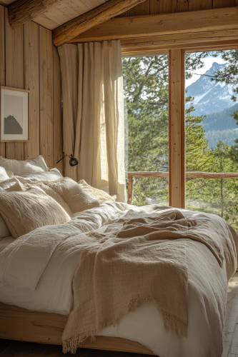 Create an image of a small cabin interior bedroom where the focus is on the breathtaking mountain views. The room should have minimal furnishings to keep the attention on the large, panoramic windows. Soft, neutral colors and a low bed can enhance the feeling of space and serenity. High-quality linens and a couple of art pieces should complement the simplicity and elegance of the room. The photograph should capture the essence of tranquility and the majestic beauty of the mountain scenery. Camera: DSLR - Canon EOS 5D Mark IV. Lens: Canon EF 24-70mm f/2.8L II USM. Composition: Wide shot, room-centered, horizontal orientation, balance between furniture and space. Film: Digital, high resolution, color profile sRGB. Camera settings: ISO 400, f/2.8, 1/60 sec. --ar 2:3 --v 6.1 --s 250