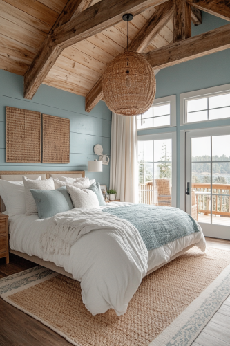Create an image of a small cabin interior bedroom with a contemporary coastal theme. The room should feature light blues, sandy tones, and coastal decor like shells and driftwood. Modern furniture and clean lines should keep the space feeling fresh and current. Large windows or French doors that open to a seaside view would enhance the coastal feel. The photo should be bright and airy, capturing the essence of a modern cabin by the sea. Camera: DSLR - Canon EOS 5D Mark IV. Lens: Canon EF 24-70mm f/2.8L II USM. Composition: Wide shot, room-centered, horizontal orientation, balance between furniture and space. Film: Digital, high resolution, color profile sRGB. Camera settings: ISO 400, f/2.8, 1/60 sec. --ar 2:3 --v 6.1 --s 250