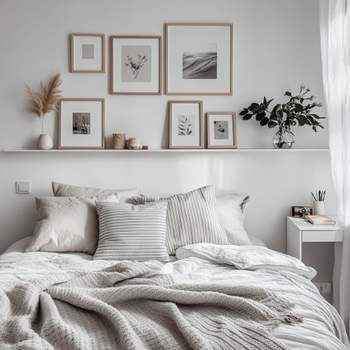 The image showcases a bright and airy bedroom with a minimalist aesthetic. The predominantly white color scheme creates a clean and serene atmosphere. Key Features: Bed: A single bed occupies the center of the room. It's neatly made with crisp ligth grey linens and adorned with a striped wool throw blanket in grey color with the fingers. Several pillows prop up the headboard, adding comfort and visual interest. Wall Decor: A collection of framed prints in varying sizes and orientations adorns the wall above the bed. The prints feature soft-toned images, contributing to the tranquil vibe of the space. Shelves: Small shelves are mounted on the wall opposite the bed, showcasing a few decorative items. Desk: A white desk with drawers is tucked into the corner of the room, providing a workspace. Lighting: The room appears to be well-lit with natural light, further enhancing the bright and airy feel. Overall Feeling: The image evokes a sense of calmness and simplicity. It's a space that promotes relaxation and focus, making it ideal for rest and study.