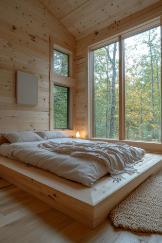 Photograph a minimalist small cabin interior bedroom with clean lines and a neutral color palette. The room should feature a simple platform bed, streamlined furniture, and large windows that fill the space with natural light. Subtle decorations like a single piece of modern art or a sleek hanging light fixture should complement the uncluttered space. The overall composition should be neat, organized, and airy, capturing the essence of minimalist living in a cabin setting. Ensure the image is sharp and detailed, highlighting the quality of materials and the openness of the design. Camera: DSLR - Canon EOS 5D Mark IV. Lens: Canon EF 24-70mm f/2.8L II USM. Composition: Wide shot, room-centered, horizontal orientation, balance between furniture and space. Film: Digital, high resolution, color profile sRGB. Camera settings: ISO 400, f/2.8, 1/60 sec. --ar 2:3 --v 6.1 --s 250