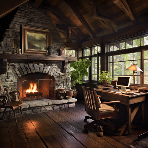 desk area by fireplace in great room of cabin, daylight, dark floor