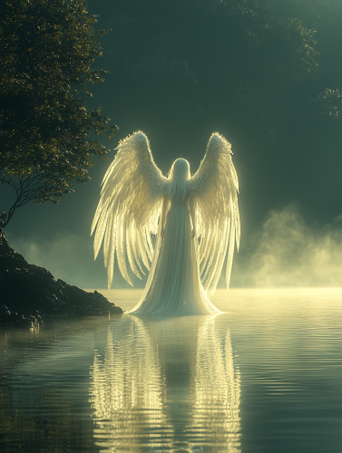 A serene, glowing angel of wish fulfillment standing at the edge of a tranquil lake at dawn. The angel’s wings are large and radiant, casting a soft glow on the water’s surface. Mist rises from the lake, and in the distance, mountains are silhouetted by the first light of day. Photorealistic, cinematic lighting, peaceful atmosphere --v 6.1 --q 2 --stylize 1000 --ar 3:4