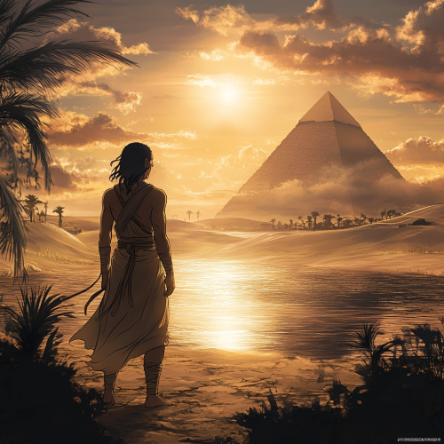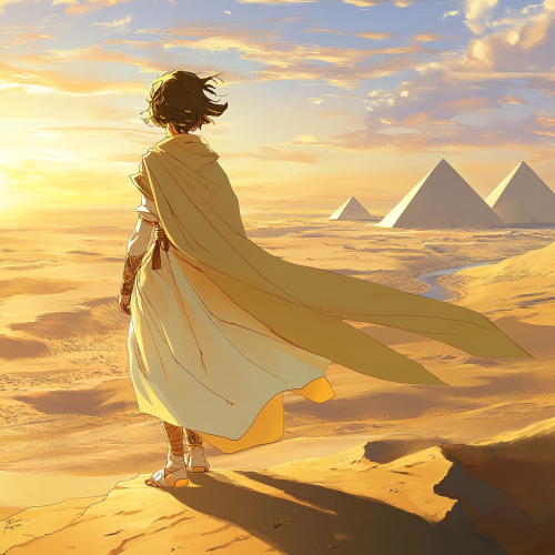 Japanese manga-style scene of young Pharaoh Khufu standing on the Giza Plateau at dawn, facing the vast desert with a serene yet determined posture. His royal robes and flowing cape catch the soft morning breeze, adding a sense of elegance and resolve. The first rays of golden sunlight break through the mist, creating a gentle, ethereal glow that envelops the scene. In the distance, pyramids emerge subtly through the soft light, adding an air of mystery. The tranquil Nile River and faint palm trees dot the background, while the expansive sand dunes capture a warm, layered look. Delicate linework, soft gradients, high detail, warm and dreamy atmosphere, cinematic lighting