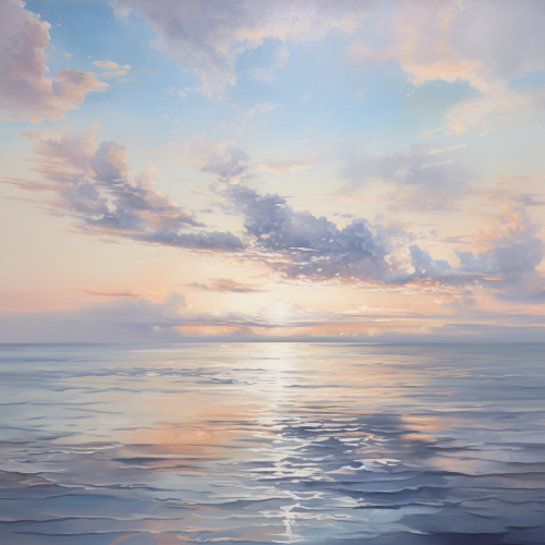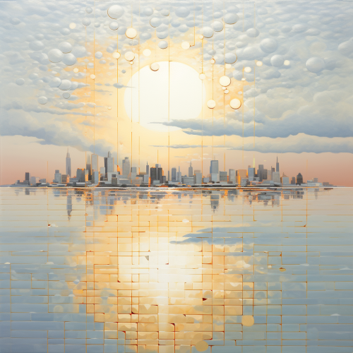 a calm painting of a calm ocean at dawn with buildings in the distance, using many silver, and white accents, use light colors, sun reflected in the ocean, clouds in the sky,