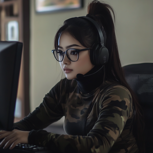 beautiful chubby 30 year old burmese IT professional wearing glasses, black trousers and woodland camouflage fitted turtleneck with camouflaged turtleneck collar, wearing black headset with her hair in ponytail and armed with M16 assault rifle. Sitting at her computer desk in IT office.