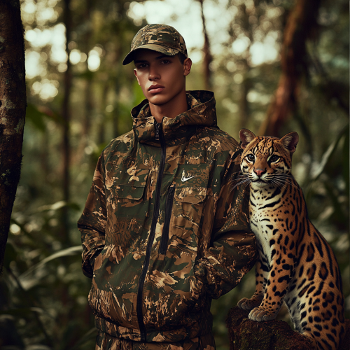 Lookbook for fashion photoshoot. Brazilian male model in stylish camouflage clothing, Atlantic Forest scenery, next to him is an ocelot. Nike brand style aesthetic.