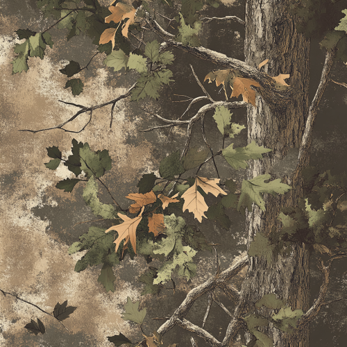 Design a unique camouflage pattern inspired by the brand REALTREE. Create a realistic forest scene with deep greens, earthy browns, and soft moss tones. Incorporate detailed textures of tree bark, scattered foliage like oak leaves and pine needles, and subtle ground cover elements such as rocks and fallen leaves. Add dappled light effects to enhance depth and natural blending --style raw