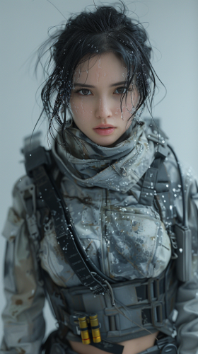 Winter Soldier in female style, a girl has a short black hair, cinematic film, full body shot from top to the bottom, no shield on hand, she is wearing a grey and white camouflage plate carrier vest with stanag pouches and grenades, she is yielding an Auto-rifle with a grenade luancher attached, --ar 9:16 --s 750 --v 6.0