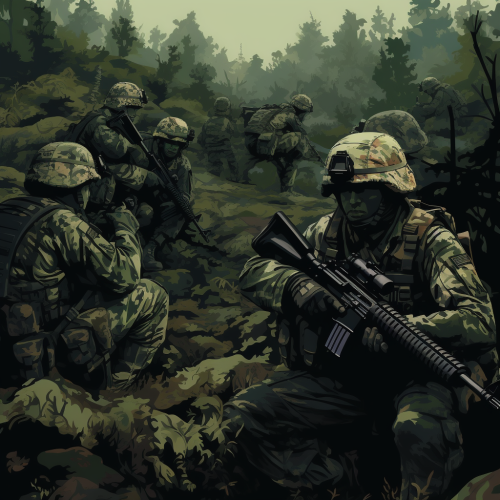 Jungle camouflage pattern with vibrant greens and organic shapes, replicating the foliage and vegetation of dense tropical forests.